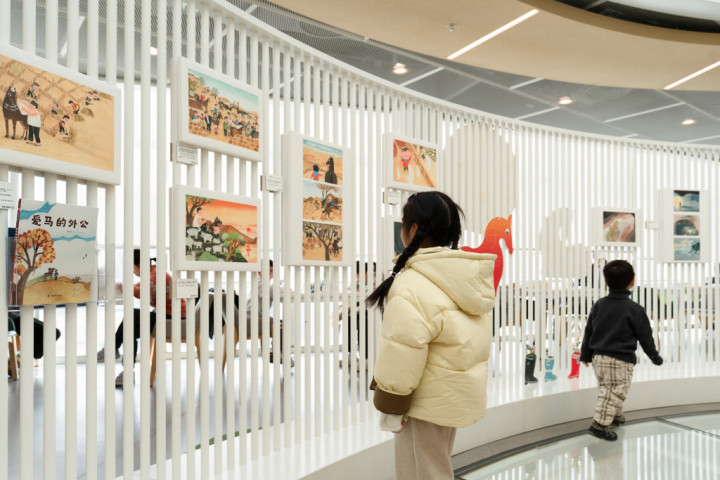在长风馆,展览以“马”为核心线索设计动线,从剪影序章缓缓引入,沿途中的马形象与色彩步步引路,最终在四楼主展区与原画、绘本及艺术装置相遇,完成一场从轮廓到细节、从远及近的沉浸式阅读之旅。在南西馆,孩子们在不经意间遇见绘本中的萌骏,享受不期而遇的阅读惊喜。小读者们踮着脚尖观看展览,从六本以马为主题的中国原创绘本中读懂自然的共生之道、友谊的守望之暖,以及中华文明绵延数千年的温情与责任。